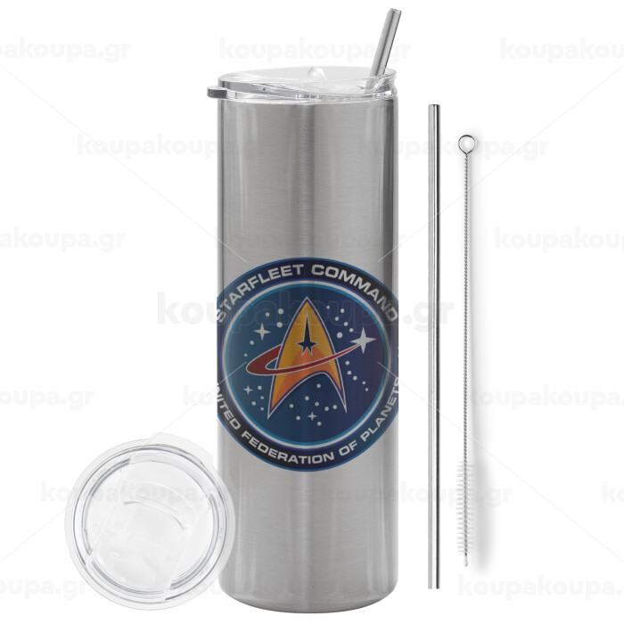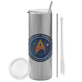 Starfleet command, Tumbler ποτήρι θερμό Ασημένιο από ανοξείδωτο ατσάλι 600ml, με μεταλλικό καλαμάκι & βούρτσα καθαρισμού