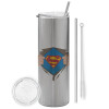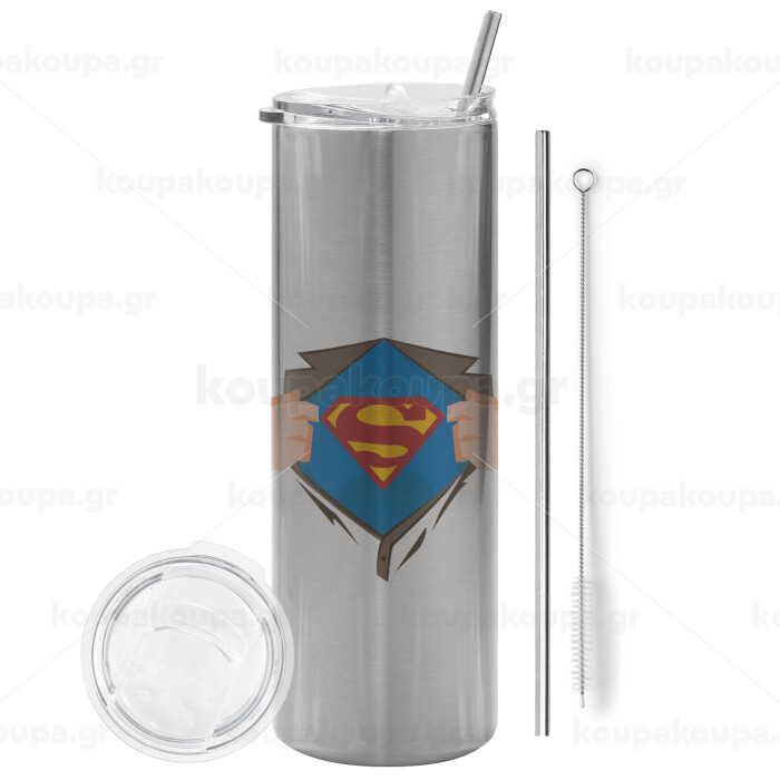 Superman hands, Tumbler ποτήρι θερμό Ασημένιο από ανοξείδωτο ατσάλι 600ml, με μεταλλικό καλαμάκι & βούρτσα καθαρισμού