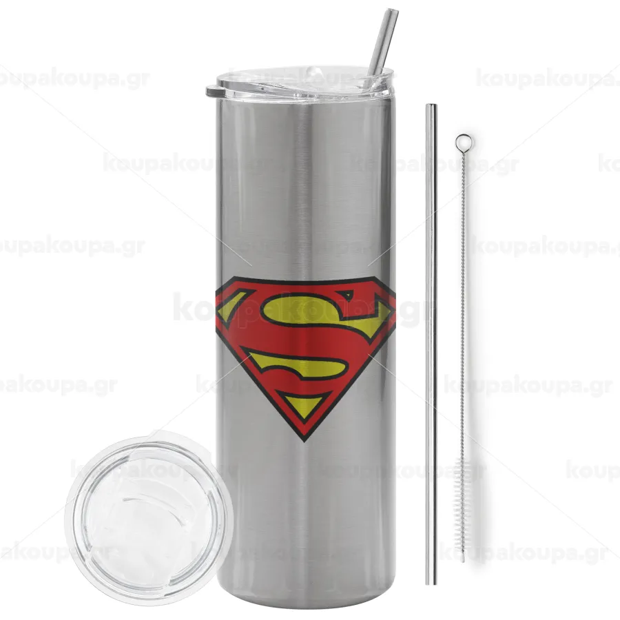 Superman vintage, Tumbler ποτήρι θερμό Ασημένιο από ανοξείδωτο ατσάλι 600ml, με μεταλλικό καλαμάκι & βούρτσα καθαρισμού