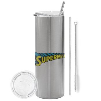Superman vintage, Tumbler ποτήρι θερμό Ασημένιο από ανοξείδωτο ατσάλι 600ml, με μεταλλικό καλαμάκι & βούρτσα καθαρισμού