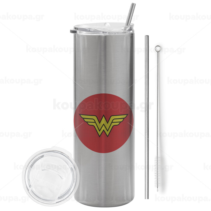Wonder woman, Tumbler ποτήρι θερμό Ασημένιο από ανοξείδωτο ατσάλι 600ml, με μεταλλικό καλαμάκι & βούρτσα καθαρισμού