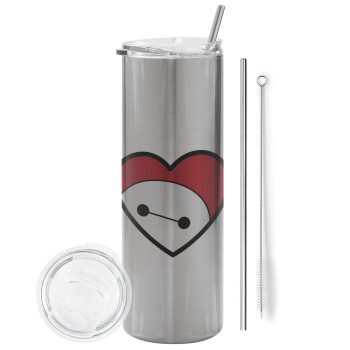 Baymax heart, Tumbler ποτήρι θερμό Ασημένιο από ανοξείδωτο ατσάλι 600ml, με μεταλλικό καλαμάκι & βούρτσα καθαρισμού