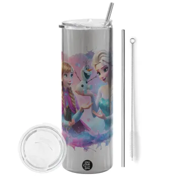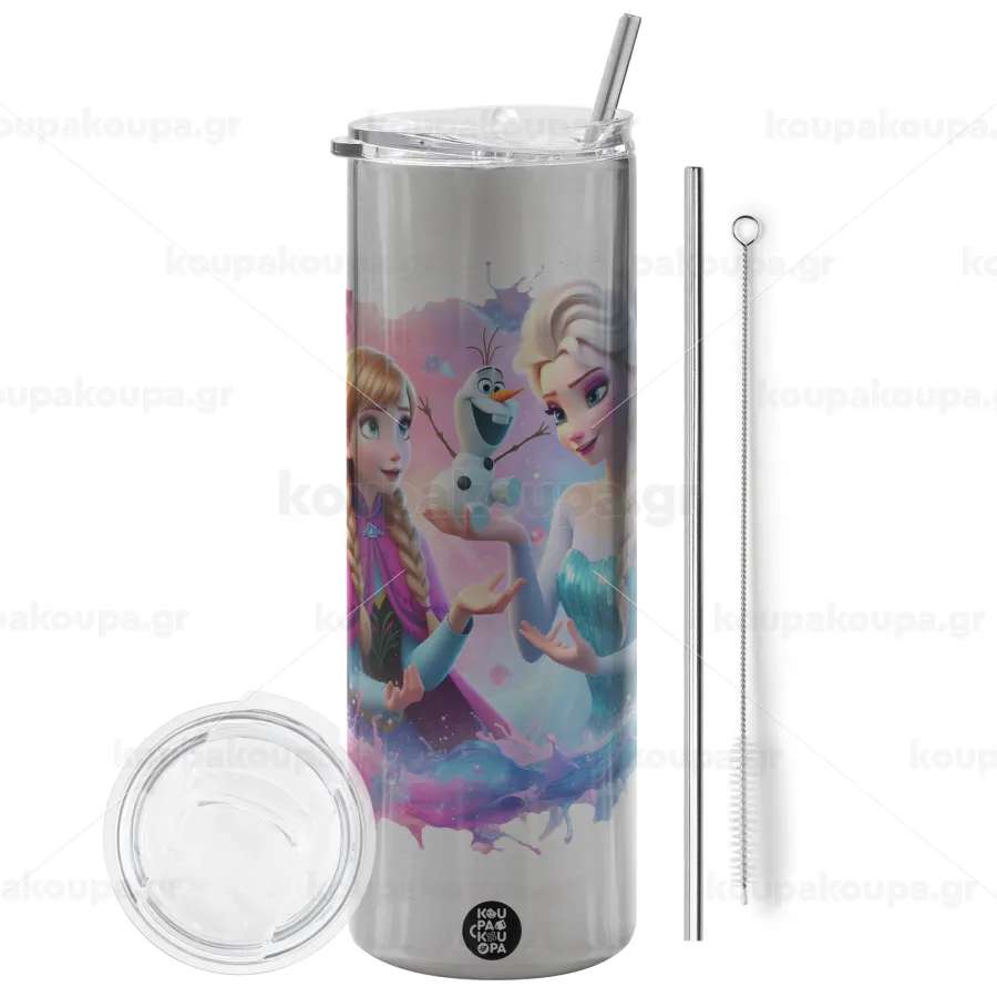 Έλσα & Άννα, Tumbler ποτήρι θερμό Ασημένιο από ανοξείδωτο ατσάλι 600ml, με μεταλλικό καλαμάκι & βούρτσα καθαρισμού