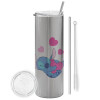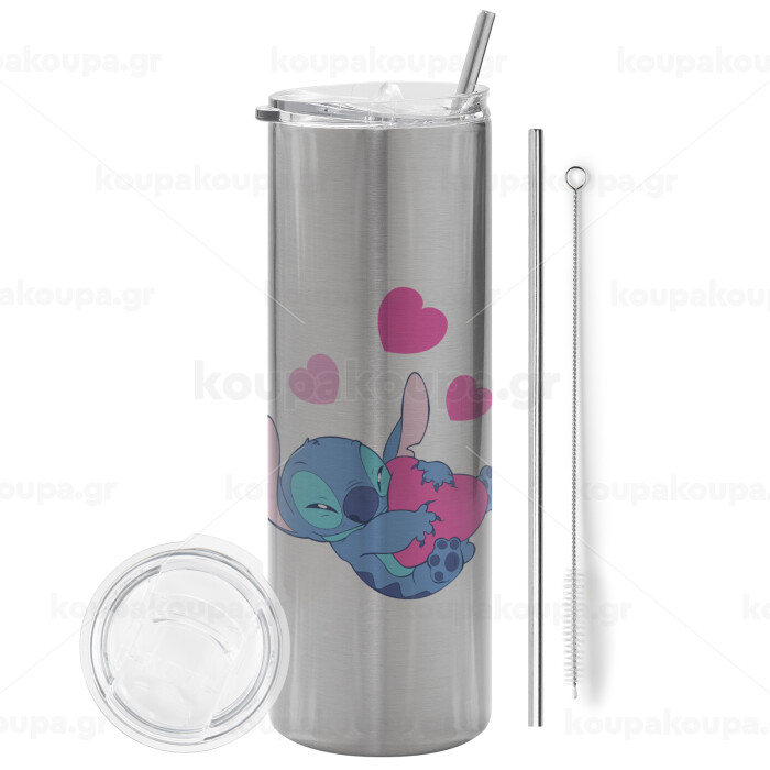 Lilo & Stitch hugs and hearts, Tumbler ποτήρι θερμό Ασημένιο από ανοξείδωτο ατσάλι 600ml, με μεταλλικό καλαμάκι & βούρτσα καθαρισμού