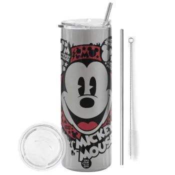 Mickey Mouse, Tumbler ποτήρι θερμό Ασημένιο από ανοξείδωτο ατσάλι 600ml, με μεταλλικό καλαμάκι & βούρτσα καθαρισμού