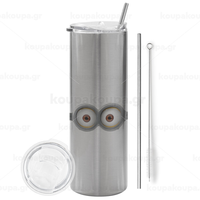 Minions, Tumbler ποτήρι θερμό Ασημένιο από ανοξείδωτο ατσάλι 600ml, με μεταλλικό καλαμάκι & βούρτσα καθαρισμού