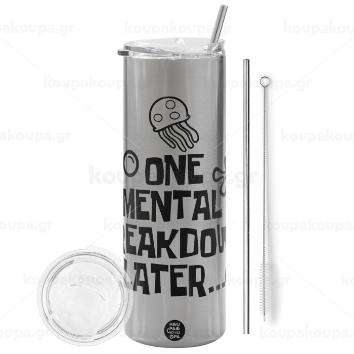 one mental breakdown later bob spongebob, Tumbler ποτήρι θερμό Ασημένιο από ανοξείδωτο ατσάλι 600ml, με μεταλλικό καλαμάκι & βούρτσα καθαρισμού