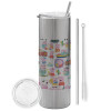 Peppa pig Characters, Tumbler ποτήρι θερμό Ασημένιο από ανοξείδωτο ατσάλι 600ml, με μεταλλικό καλαμάκι & βούρτσα καθαρισμού