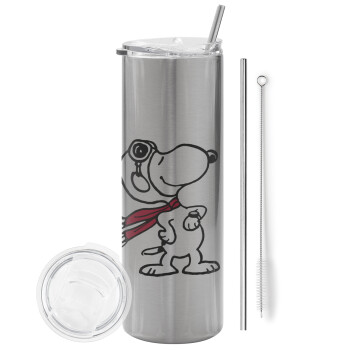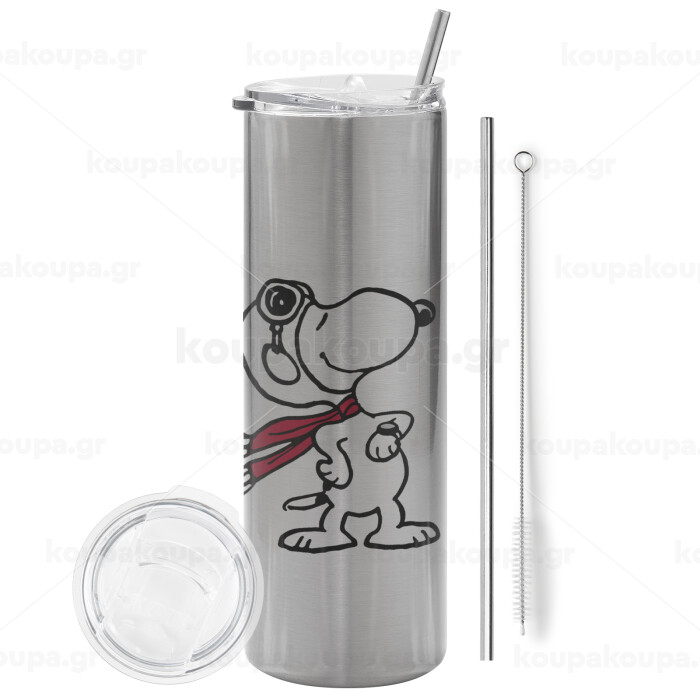 Snoopy ο πιλότος, Tumbler ποτήρι θερμό Ασημένιο από ανοξείδωτο ατσάλι 600ml, με μεταλλικό καλαμάκι & βούρτσα καθαρισμού