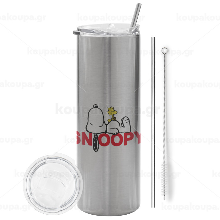 Snoopy sleep, Tumbler ποτήρι θερμό Ασημένιο από ανοξείδωτο ατσάλι 600ml, με μεταλλικό καλαμάκι & βούρτσα καθαρισμού