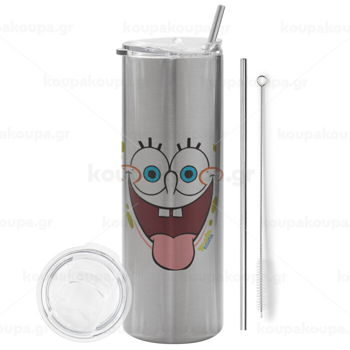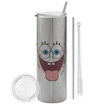 Μπομπ Σφουγγαράκης χαμόγελο, Tumbler ποτήρι θερμό Ασημένιο από ανοξείδωτο ατσάλι 600ml, με μεταλλικό καλαμάκι & βούρτσα καθαρισμού