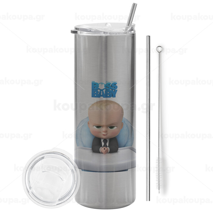 The boss baby, Tumbler ποτήρι θερμό Ασημένιο από ανοξείδωτο ατσάλι 600ml, με μεταλλικό καλαμάκι & βούρτσα καθαρισμού