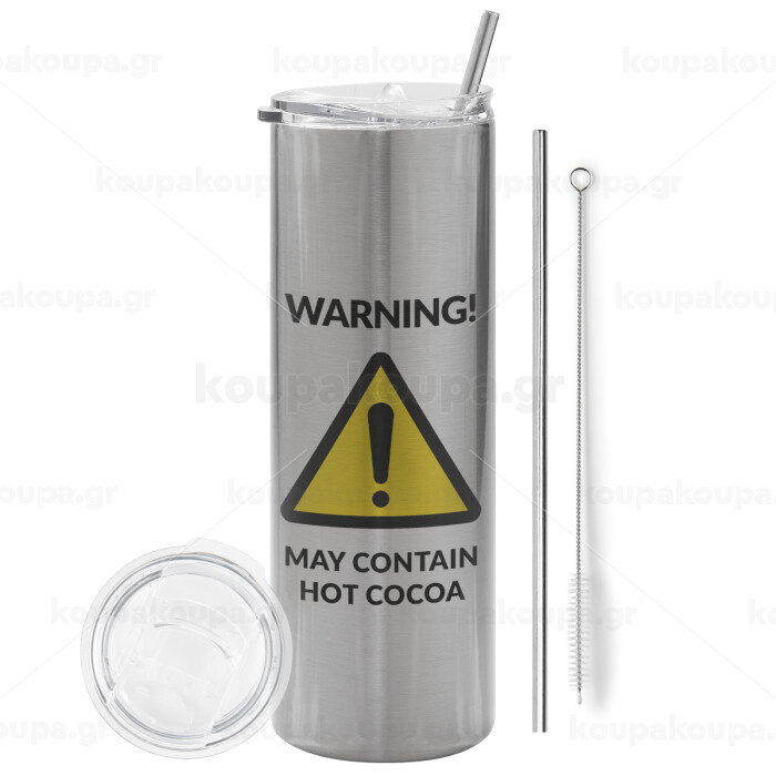 WARNING MAY CONTAIN HOT COCOA MUG PADDINGTON, Tumbler ποτήρι θερμό Ασημένιο από ανοξείδωτο ατσάλι 600ml, με μεταλλικό καλαμάκι & βούρτσα καθαρισμού