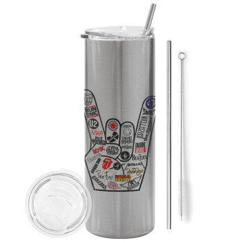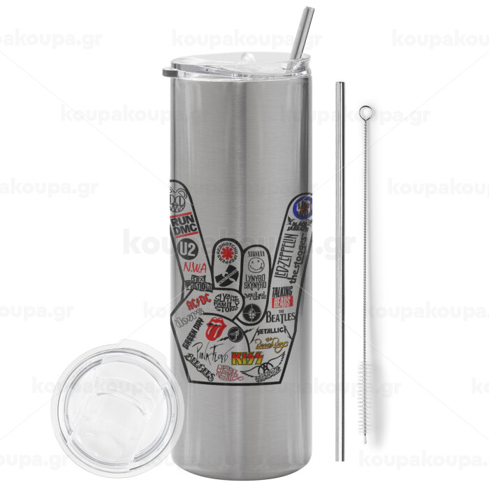 Best Rock Bands hand, Tumbler ποτήρι θερμό Ασημένιο από ανοξείδωτο ατσάλι 600ml, με μεταλλικό καλαμάκι & βούρτσα καθαρισμού