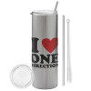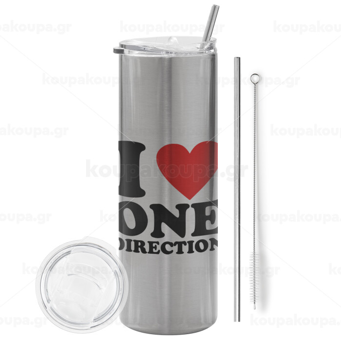 I Love, One Direction, Tumbler ποτήρι θερμό Ασημένιο από ανοξείδωτο ατσάλι 600ml, με μεταλλικό καλαμάκι & βούρτσα καθαρισμού