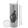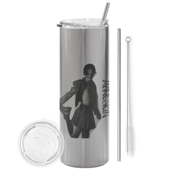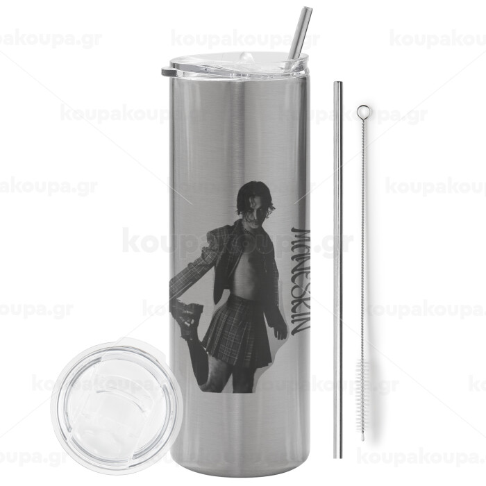 Maneskin Damiano David, Tumbler ποτήρι θερμό Ασημένιο από ανοξείδωτο ατσάλι 600ml, με μεταλλικό καλαμάκι & βούρτσα καθαρισμού