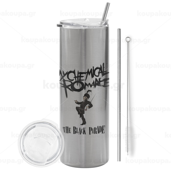 My Chemical Romance Black Parade, Tumbler ποτήρι θερμό Ασημένιο από ανοξείδωτο ατσάλι 600ml, με μεταλλικό καλαμάκι & βούρτσα καθαρισμού