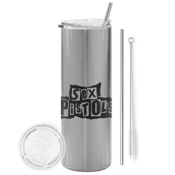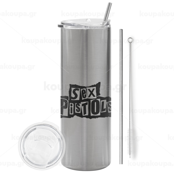 Sex Pistols, Tumbler ποτήρι θερμό Ασημένιο από ανοξείδωτο ατσάλι 600ml, με μεταλλικό καλαμάκι & βούρτσα καθαρισμού
