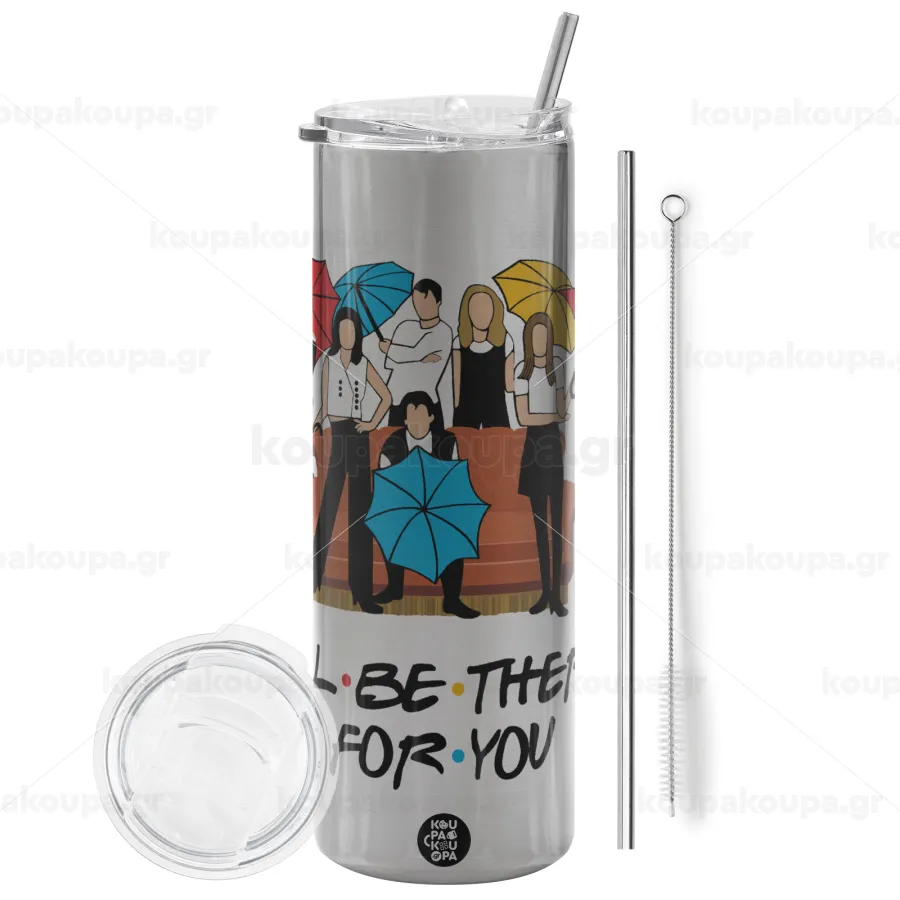 Friends cover, Tumbler ποτήρι θερμό Ασημένιο από ανοξείδωτο ατσάλι 600ml, με μεταλλικό καλαμάκι & βούρτσα καθαρισμού