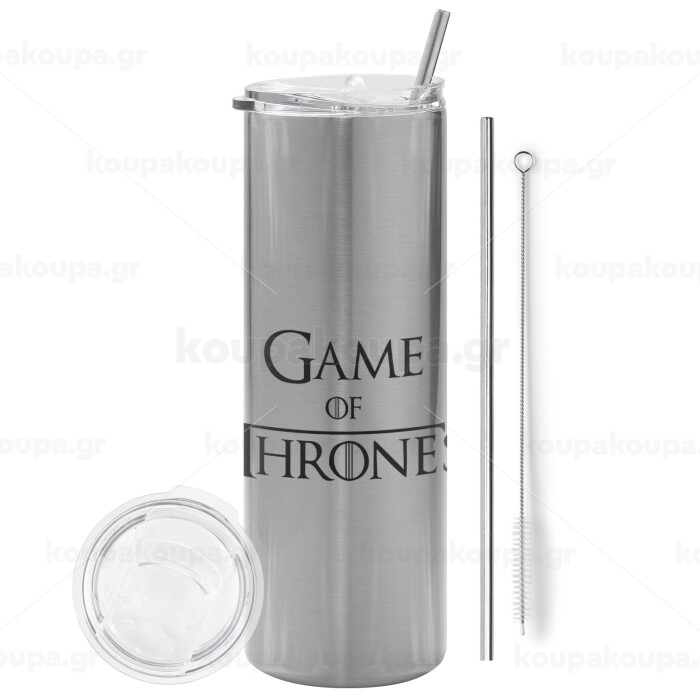 Game of Thrones, Tumbler ποτήρι θερμό Ασημένιο από ανοξείδωτο ατσάλι 600ml, με μεταλλικό καλαμάκι & βούρτσα καθαρισμού