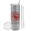 GOT House Targaryen, Fire Blood, Tumbler ποτήρι θερμό Ασημένιο από ανοξείδωτο ατσάλι 600ml, με μεταλλικό καλαμάκι & βούρτσα καθαρισμού
