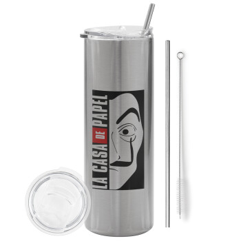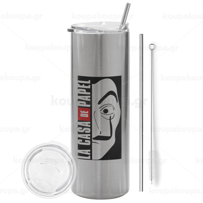 La casa de papel vertical, Tumbler ποτήρι θερμό Ασημένιο από ανοξείδωτο ατσάλι 600ml, με μεταλλικό καλαμάκι & βούρτσα καθαρισμού