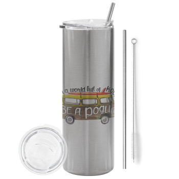 Outerbanks Pogue Life, Tumbler ποτήρι θερμό Ασημένιο από ανοξείδωτο ατσάλι 600ml, με μεταλλικό καλαμάκι & βούρτσα καθαρισμού