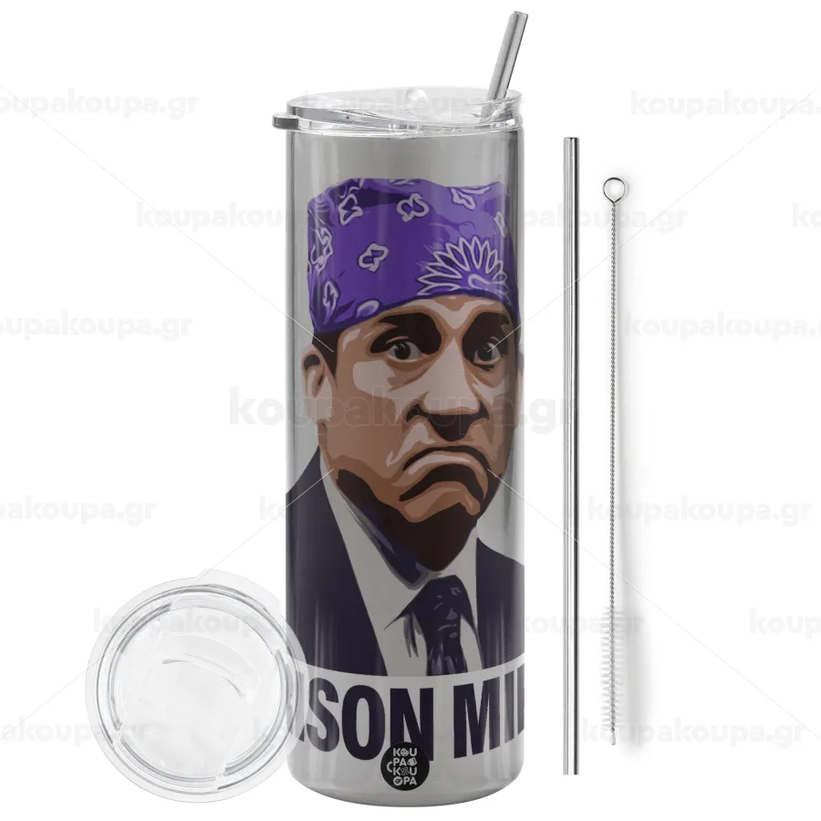 Prison Mike The office, Tumbler ποτήρι θερμό Ασημένιο από ανοξείδωτο ατσάλι 600ml, με μεταλλικό καλαμάκι & βούρτσα καθαρισμού