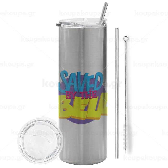 Saved by the Bell, Tumbler ποτήρι θερμό Ασημένιο από ανοξείδωτο ατσάλι 600ml, με μεταλλικό καλαμάκι & βούρτσα καθαρισμού