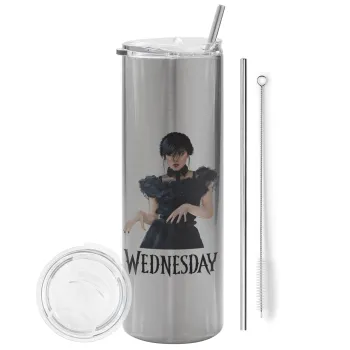 Wednesday Adams, dance with hands, Tumbler ποτήρι θερμό Ασημένιο από ανοξείδωτο ατσάλι 600ml, με μεταλλικό καλαμάκι & βούρτσα καθαρισμού