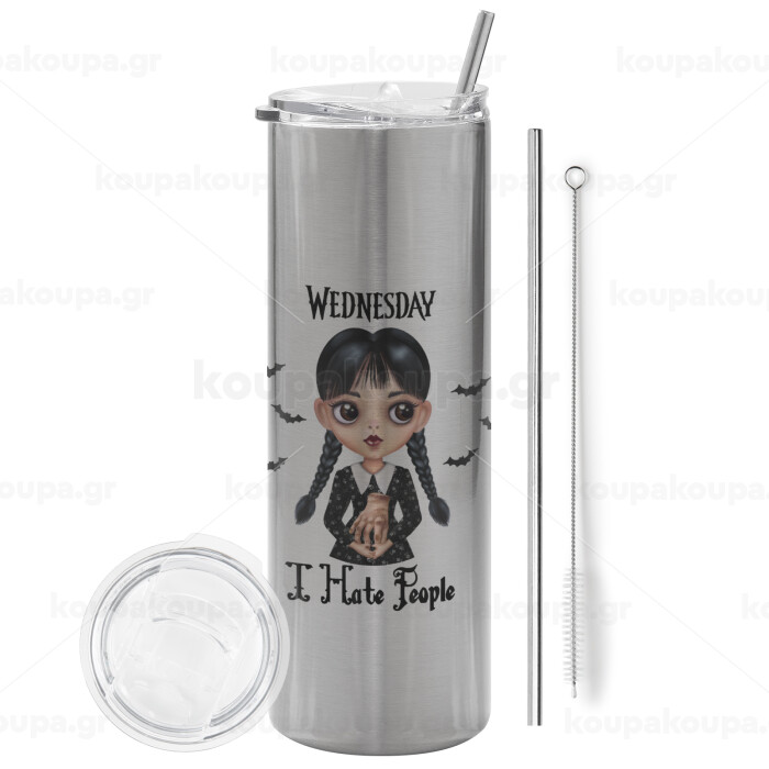 Wednesday Adams, i hate people, Tumbler ποτήρι θερμό Ασημένιο από ανοξείδωτο ατσάλι 600ml, με μεταλλικό καλαμάκι & βούρτσα καθαρισμού