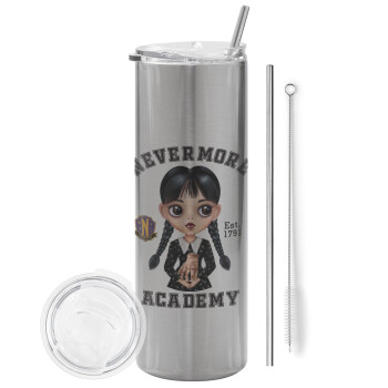 Wednesday Adams, nevermore, Tumbler ποτήρι θερμό Ασημένιο από ανοξείδωτο ατσάλι 600ml, με μεταλλικό καλαμάκι & βούρτσα καθαρισμού