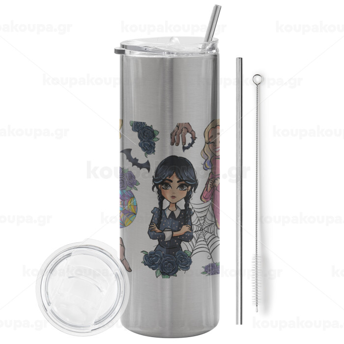 Wednesday and Enid Sinclair, Tumbler ποτήρι θερμό Ασημένιο από ανοξείδωτο ατσάλι 600ml, με μεταλλικό καλαμάκι & βούρτσα καθαρισμού