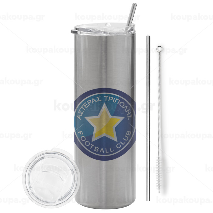 Αστέρας Τρίπολης, Tumbler ποτήρι θερμό Ασημένιο από ανοξείδωτο ατσάλι 600ml, με μεταλλικό καλαμάκι & βούρτσα καθαρισμού