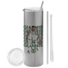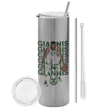 Γιάννης Αντετοκούνμπο, Tumbler ποτήρι θερμό Ασημένιο από ανοξείδωτο ατσάλι 600ml, με μεταλλικό καλαμάκι & βούρτσα καθαρισμού
