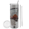 Basketball, Tumbler ποτήρι θερμό Ασημένιο από ανοξείδωτο ατσάλι 600ml, με μεταλλικό καλαμάκι & βούρτσα καθαρισμού
