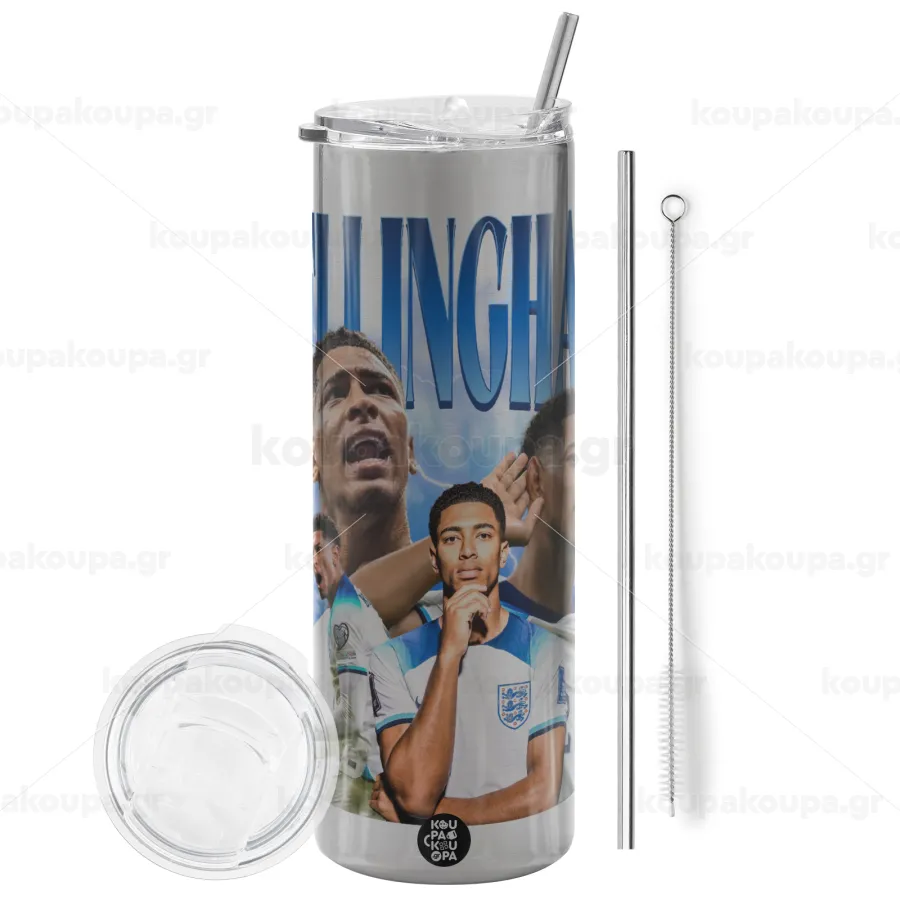 Jude Bellingham, Tumbler ποτήρι θερμό Ασημένιο από ανοξείδωτο ατσάλι 600ml, με μεταλλικό καλαμάκι & βούρτσα καθαρισμού