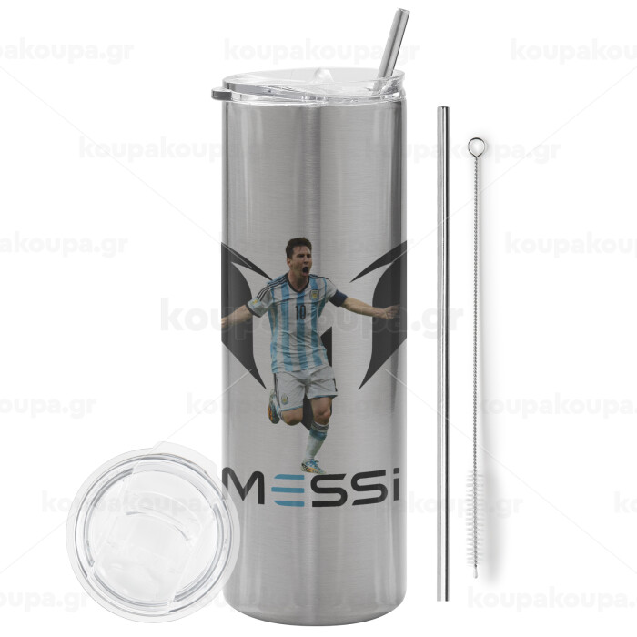 Λιονέλ Μέσι, Leo Messi, Tumbler ποτήρι θερμό Ασημένιο από ανοξείδωτο ατσάλι 600ml, με μεταλλικό καλαμάκι & βούρτσα καθαρισμού