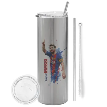 Λιονέλ Μέσι, Tumbler ποτήρι θερμό Ασημένιο από ανοξείδωτο ατσάλι 600ml, με μεταλλικό καλαμάκι & βούρτσα καθαρισμού