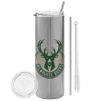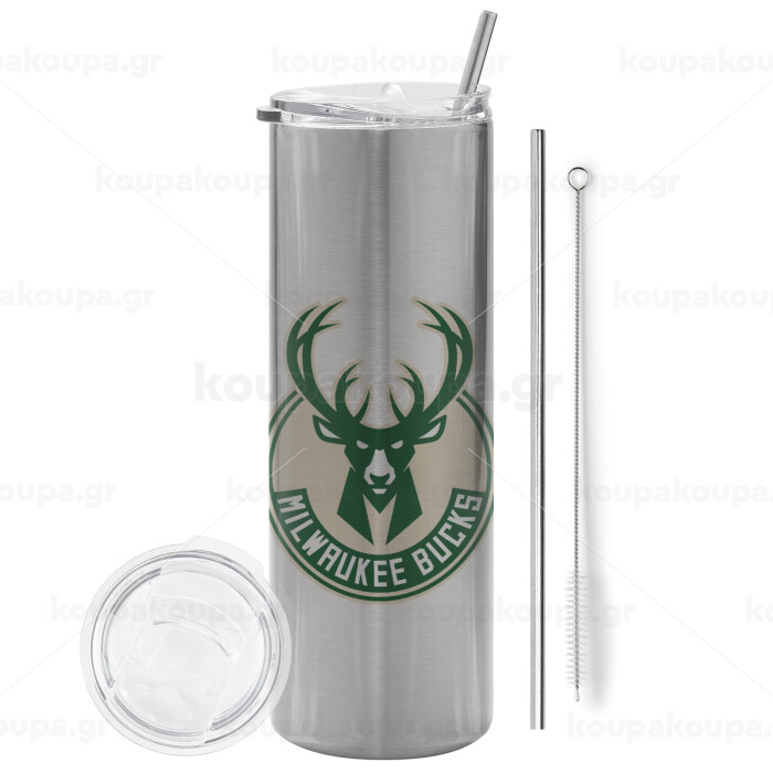 Milwaukee bucks, Tumbler ποτήρι θερμό Ασημένιο από ανοξείδωτο ατσάλι 600ml, με μεταλλικό καλαμάκι & βούρτσα καθαρισμού