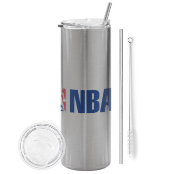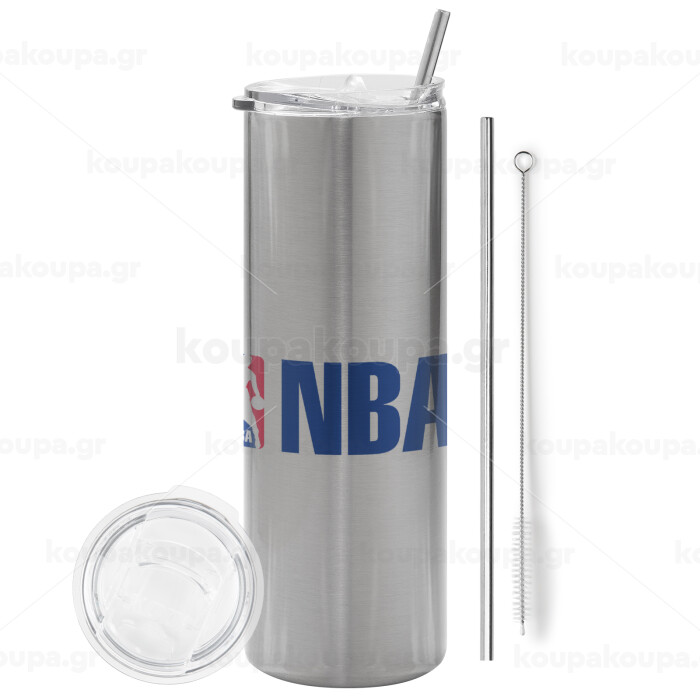 NBA, Tumbler ποτήρι θερμό Ασημένιο από ανοξείδωτο ατσάλι 600ml, με μεταλλικό καλαμάκι & βούρτσα καθαρισμού