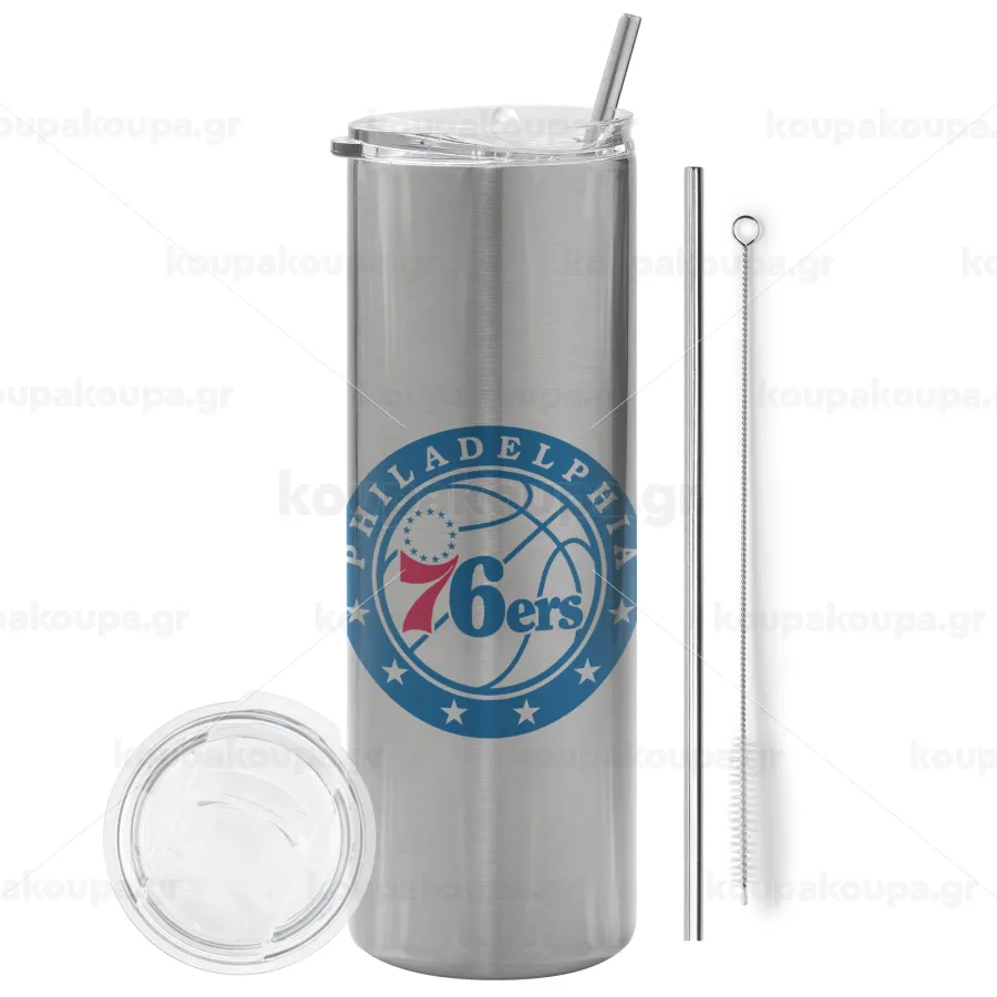 Philadelphia 76ers, Tumbler ποτήρι θερμό Ασημένιο από ανοξείδωτο ατσάλι 600ml, με μεταλλικό καλαμάκι & βούρτσα καθαρισμού