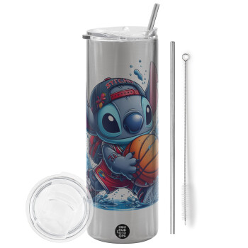 Stitch Basketball, Tumbler ποτήρι θερμό Ασημένιο από ανοξείδωτο ατσάλι 600ml, με μεταλλικό καλαμάκι & βούρτσα καθαρισμού