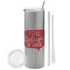 Ι still believe in santa, Tumbler ποτήρι θερμό Ασημένιο από ανοξείδωτο ατσάλι 600ml, με μεταλλικό καλαμάκι & βούρτσα καθαρισμού