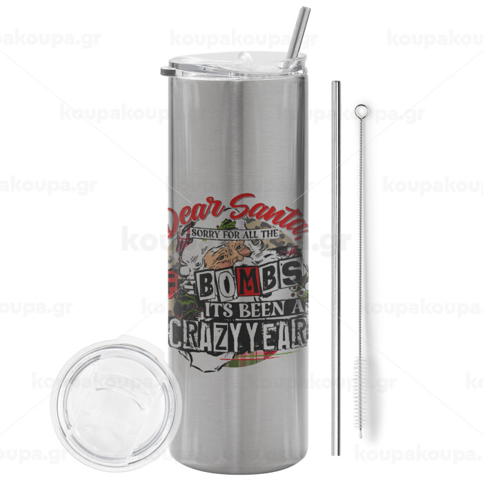 Dear Santa, sorry for all the F-bombs, Tumbler ποτήρι θερμό Ασημένιο από ανοξείδωτο ατσάλι 600ml, με μεταλλικό καλαμάκι & βούρτσα καθαρισμού