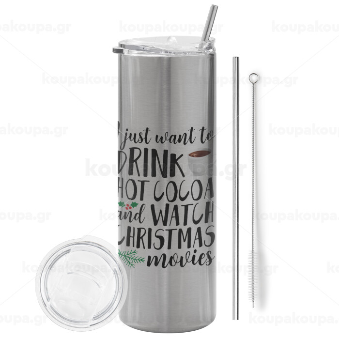 I just want to drink hot cocoa and watch christmas movies, Tumbler ποτήρι θερμό Ασημένιο από ανοξείδωτο ατσάλι 600ml, με μεταλλικό καλαμάκι & βούρτσα καθαρισμού