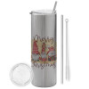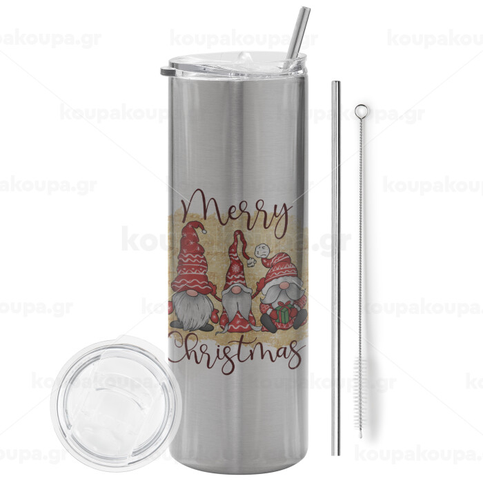 Xmas Elves, Tumbler ποτήρι θερμό Ασημένιο από ανοξείδωτο ατσάλι 600ml, με μεταλλικό καλαμάκι & βούρτσα καθαρισμού