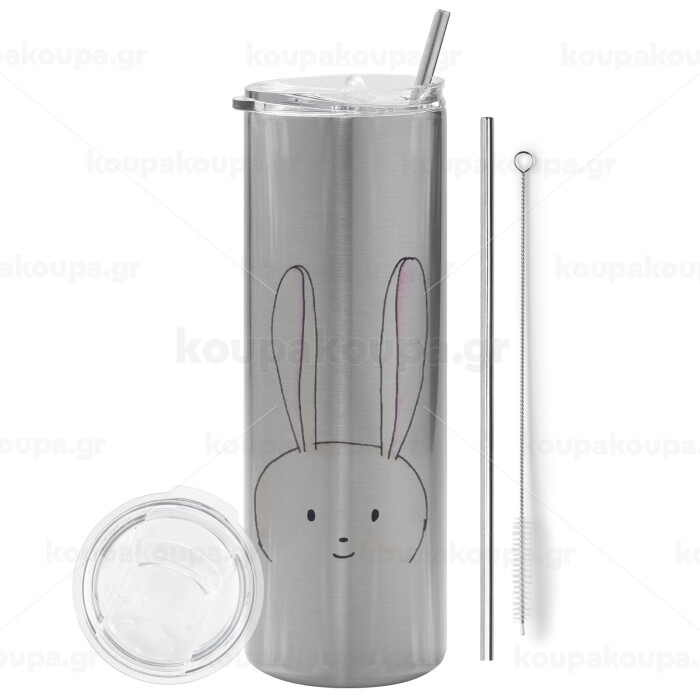 Ο λαγός του πάσχα, Tumbler ποτήρι θερμό Ασημένιο από ανοξείδωτο ατσάλι 600ml, με μεταλλικό καλαμάκι & βούρτσα καθαρισμού