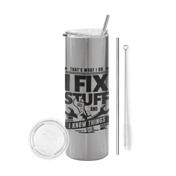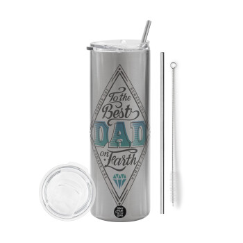 Best dad ever μπλε μουστάκι, Tumbler ποτήρι θερμό Ασημένιο από ανοξείδωτο ατσάλι 600ml, με μεταλλικό καλαμάκι & βούρτσα καθαρισμού