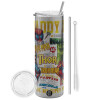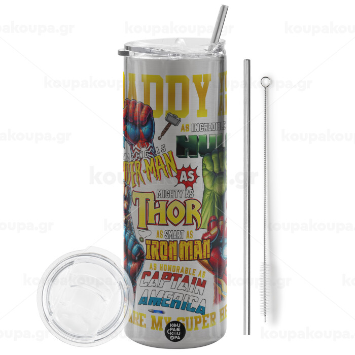 Daddy You Are my Hero, Tumbler ποτήρι θερμό Ασημένιο από ανοξείδωτο ατσάλι 600ml, με μεταλλικό καλαμάκι & βούρτσα καθαρισμού